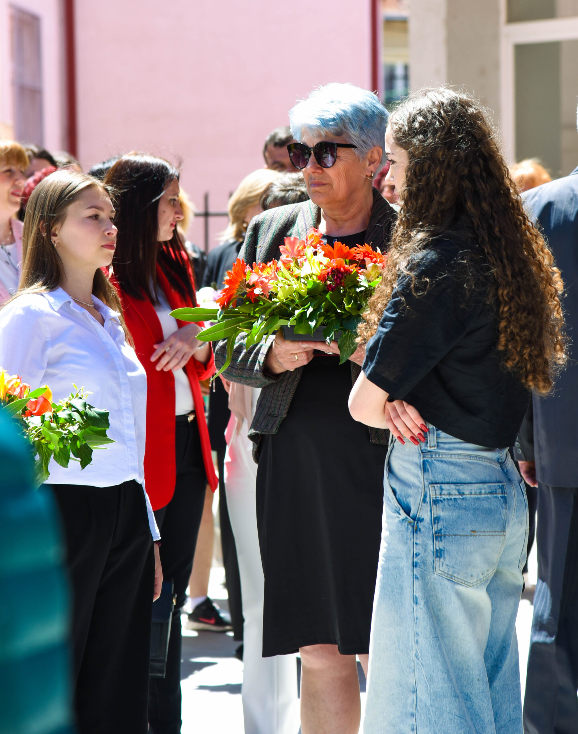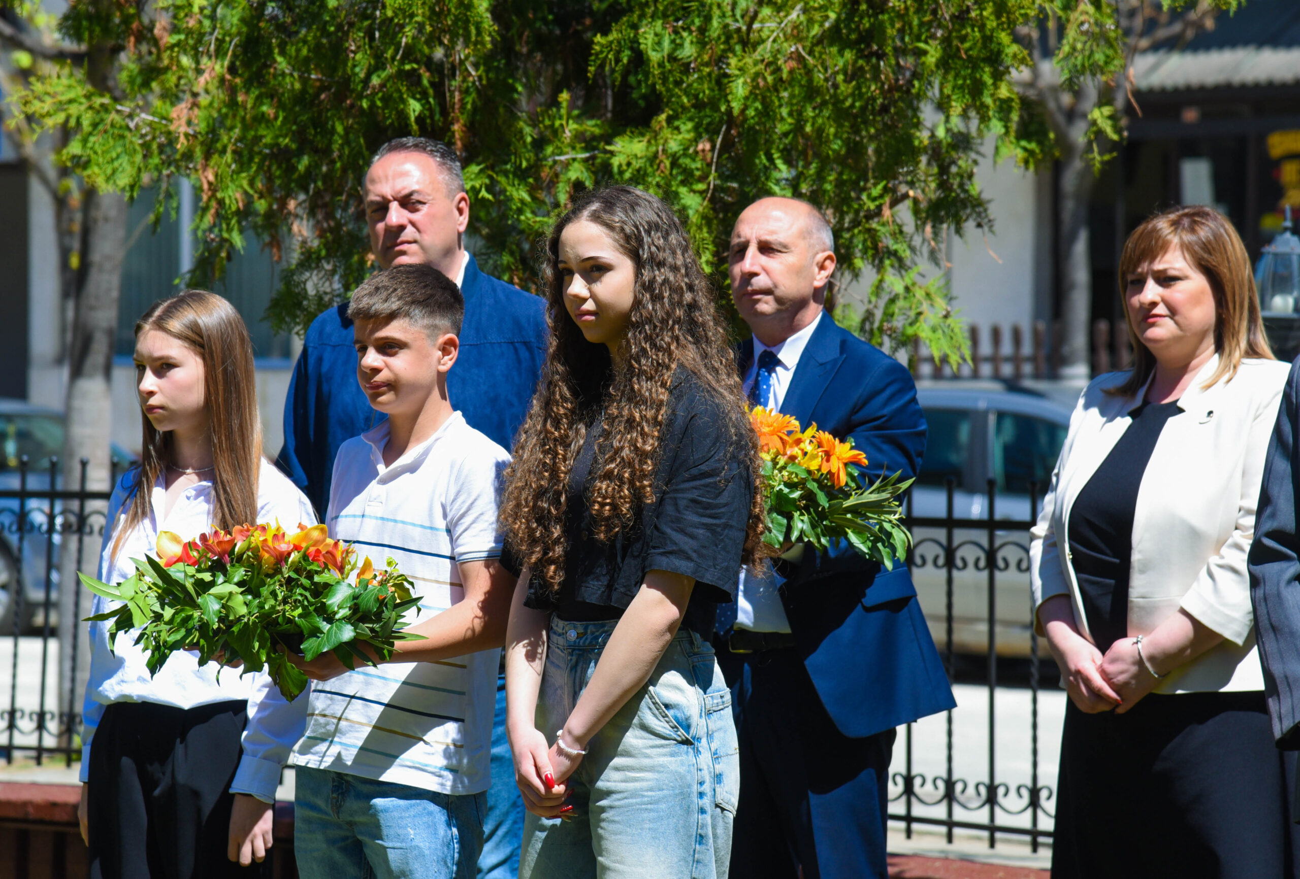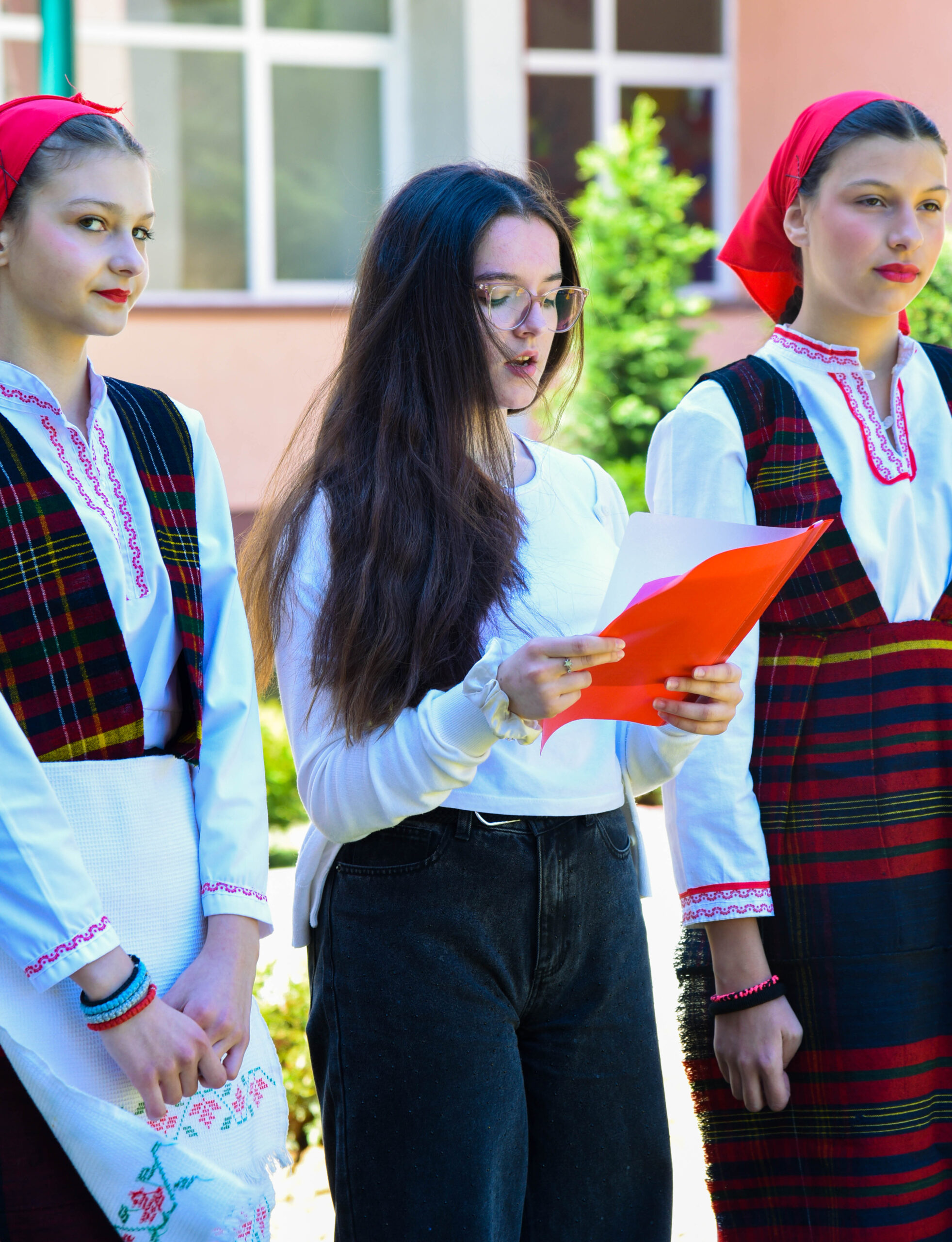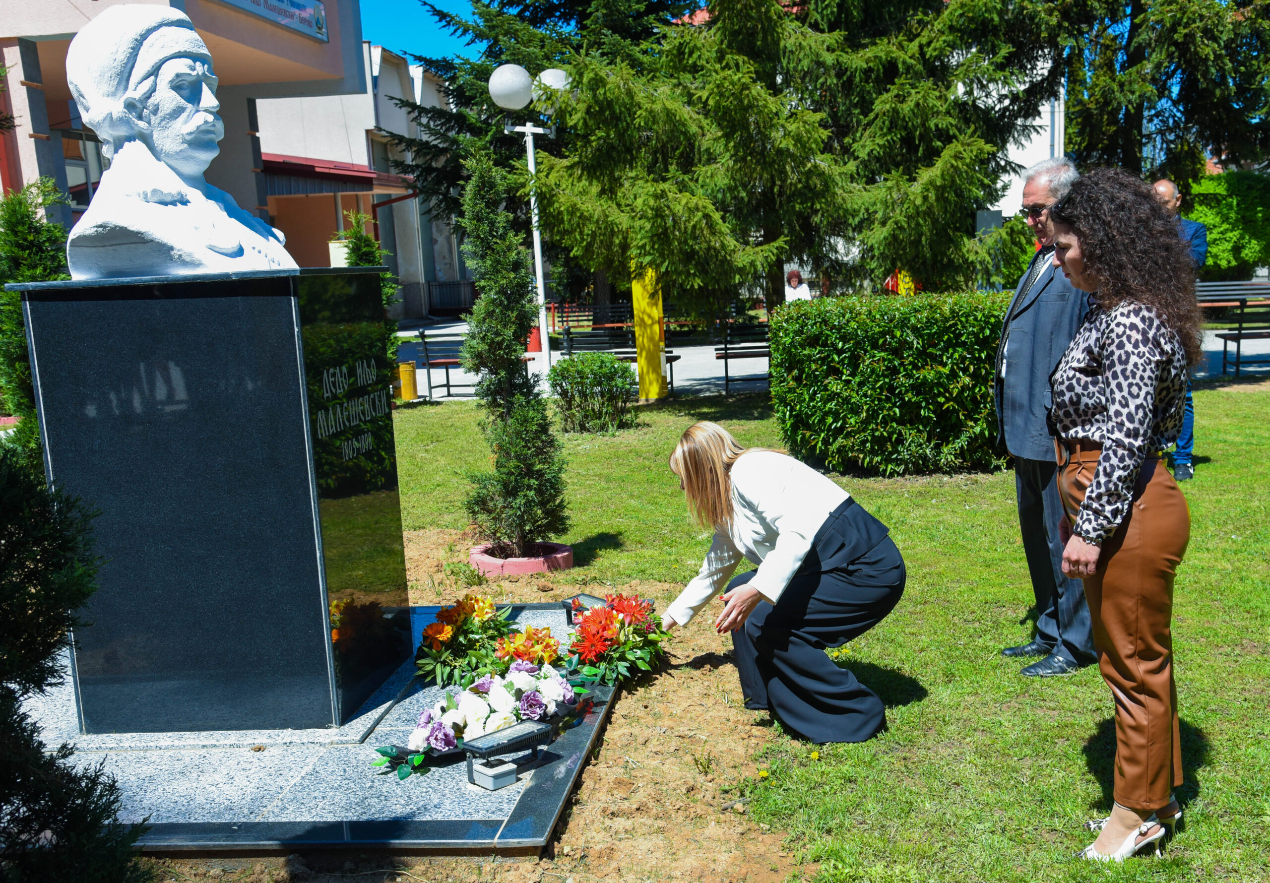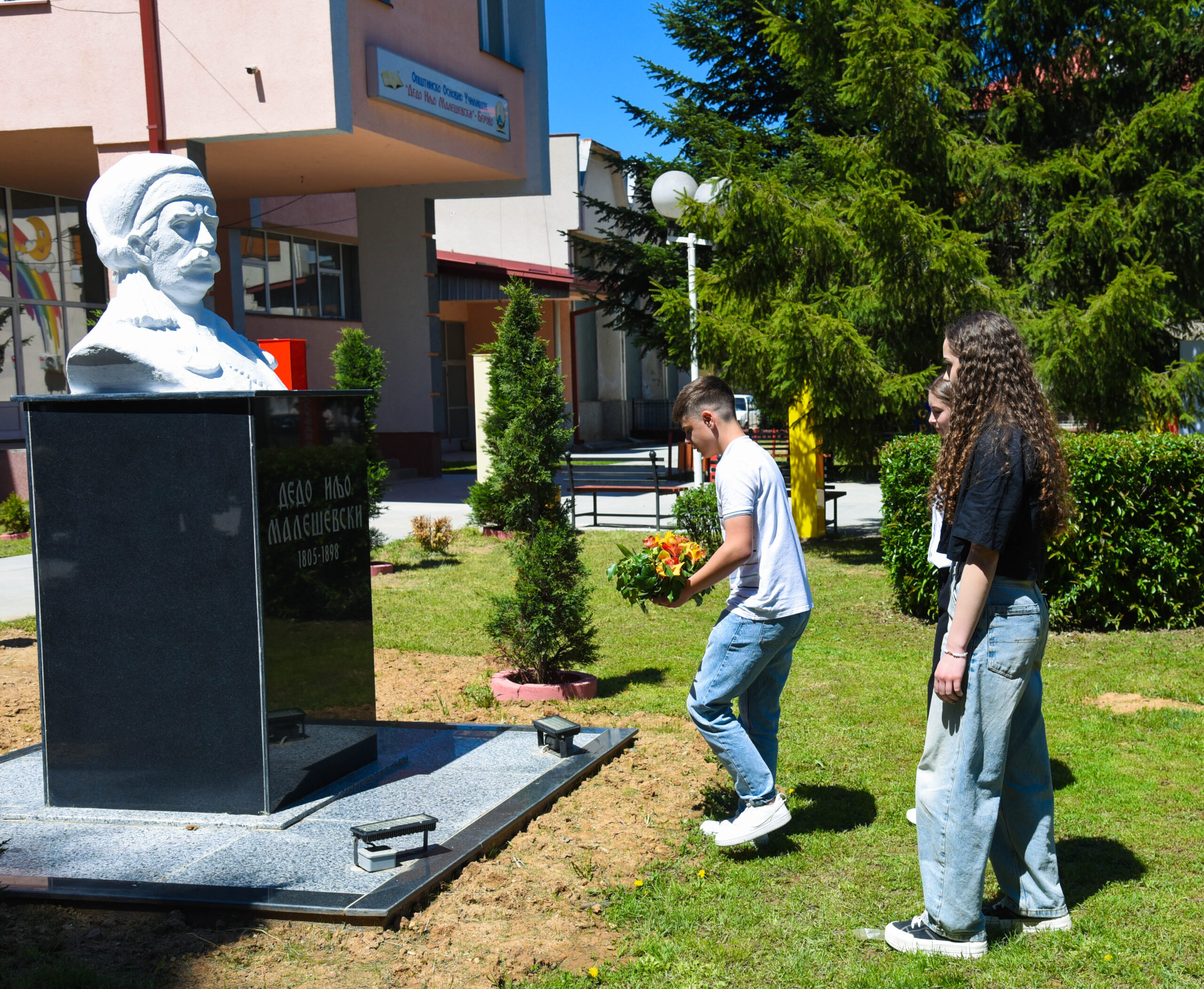 Прославата започна точно напладне, во 12 часот. Најпрво, со должна почит положивме свежо цвеќе пред бистата на Дедо Иљо Малешевски, сместена во нашиот училишен двор. Тоа беше момент на сеќавање и оддавање почит кон ликот чии идеали нѐ водат.
